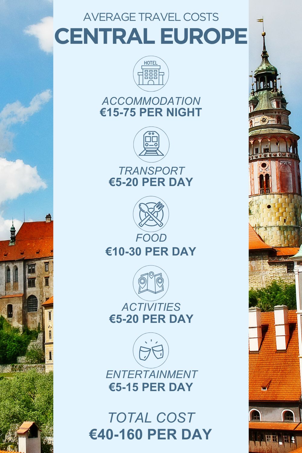 Wondering how much is the average cost of travelling in Central Europe? To tie things together, I’ve averaged all of the general daily prices. This is generally what to expect to spend per person per day, assuming you’re splitting some costs (like accommodation or car hire) between two people.