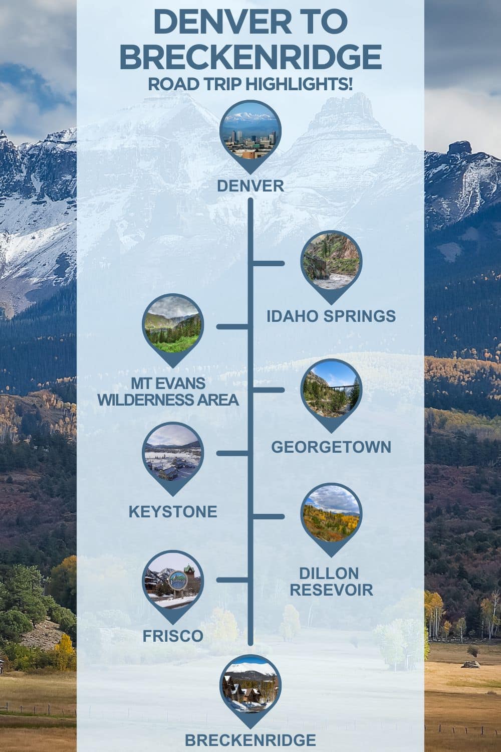 An infographic with images of Colorado, text reading "Denver to Breckenridge road trip highlights" and 6 stops with images between the two