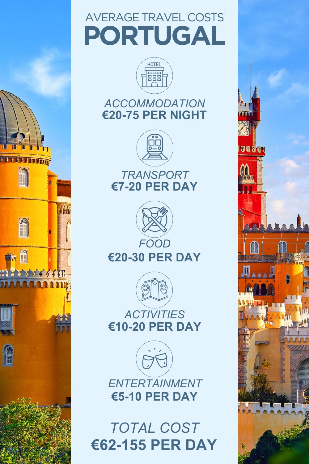 The approximate values are summarised below and totalled to provide a rough estimate as to how much the average trip to Portugal cost will be per person, per day.