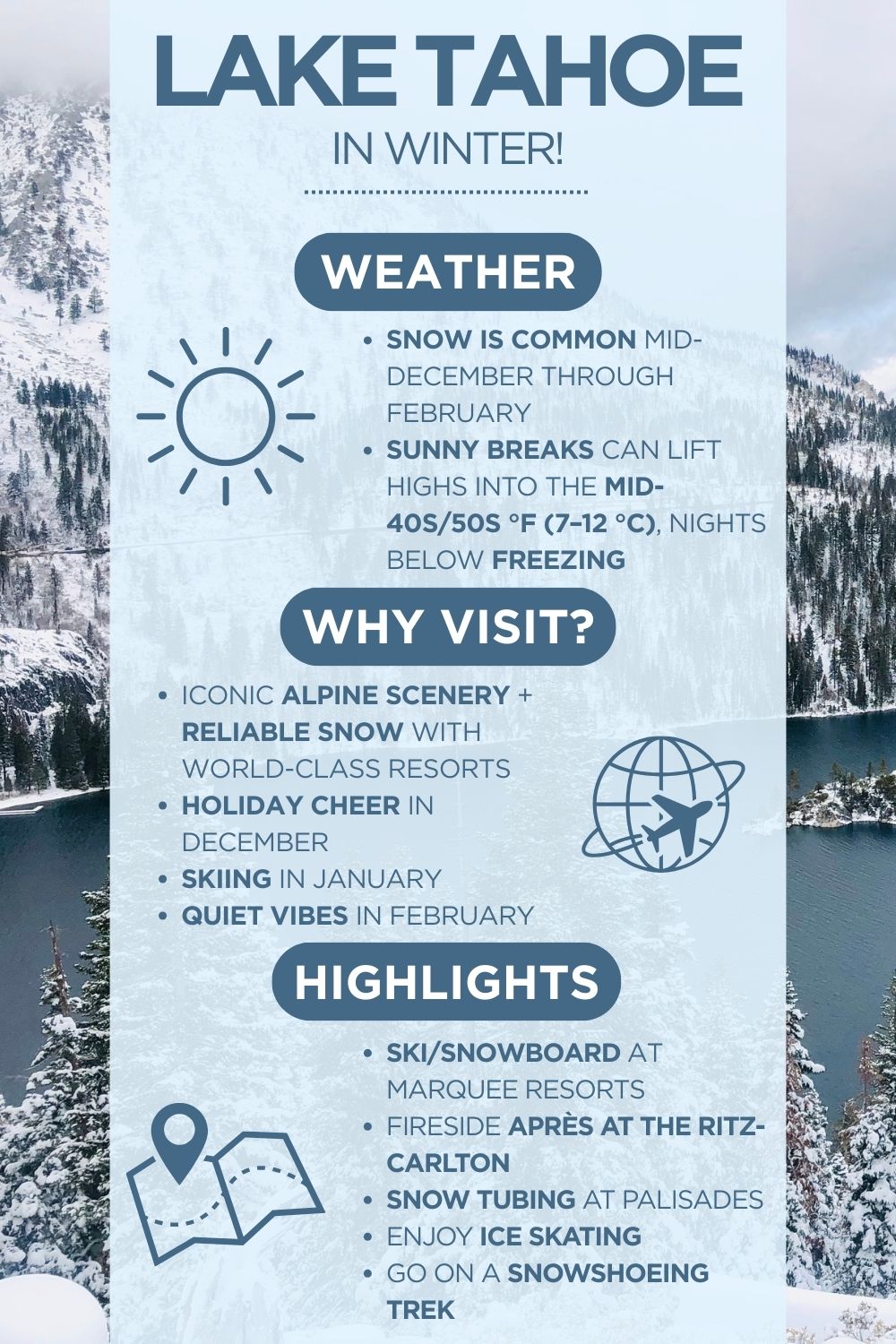 An infographic with images of Lake Tahoe with text saying "Lake Tahoe in winter" & describing the weather, why visit and highlights of visiting