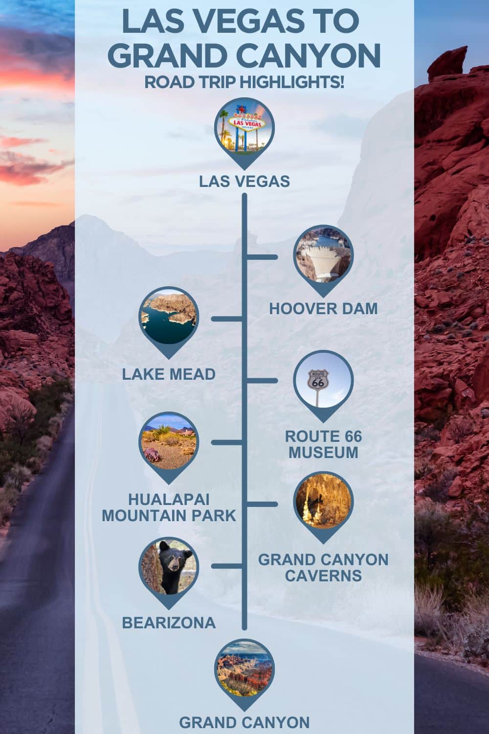 An infographic with images of arizona, text reading "las vegas road trip highlights" and 6 stops with images between the two