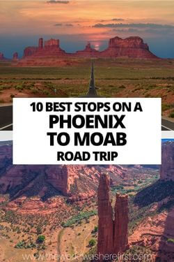 An infographic with images of arizona, text reading "phoenix to moab road trip highlights" and 6 stops with images between the two