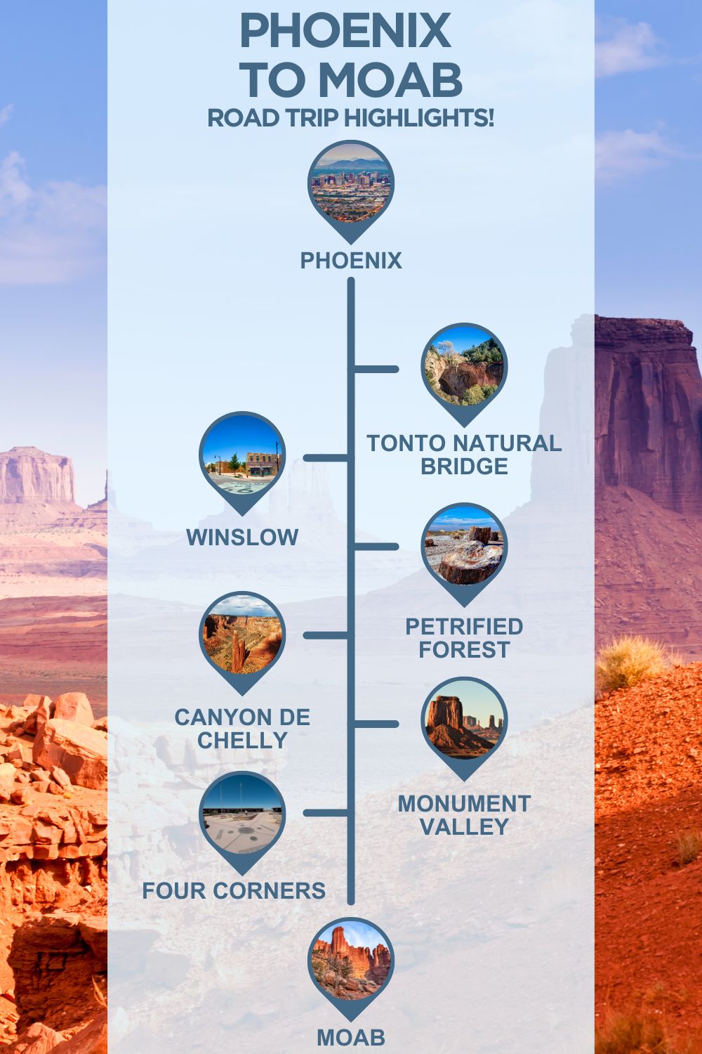 An infographic with images of arizona, text reading "phoenix to moab road trip highlights" and 6 stops with images between the two