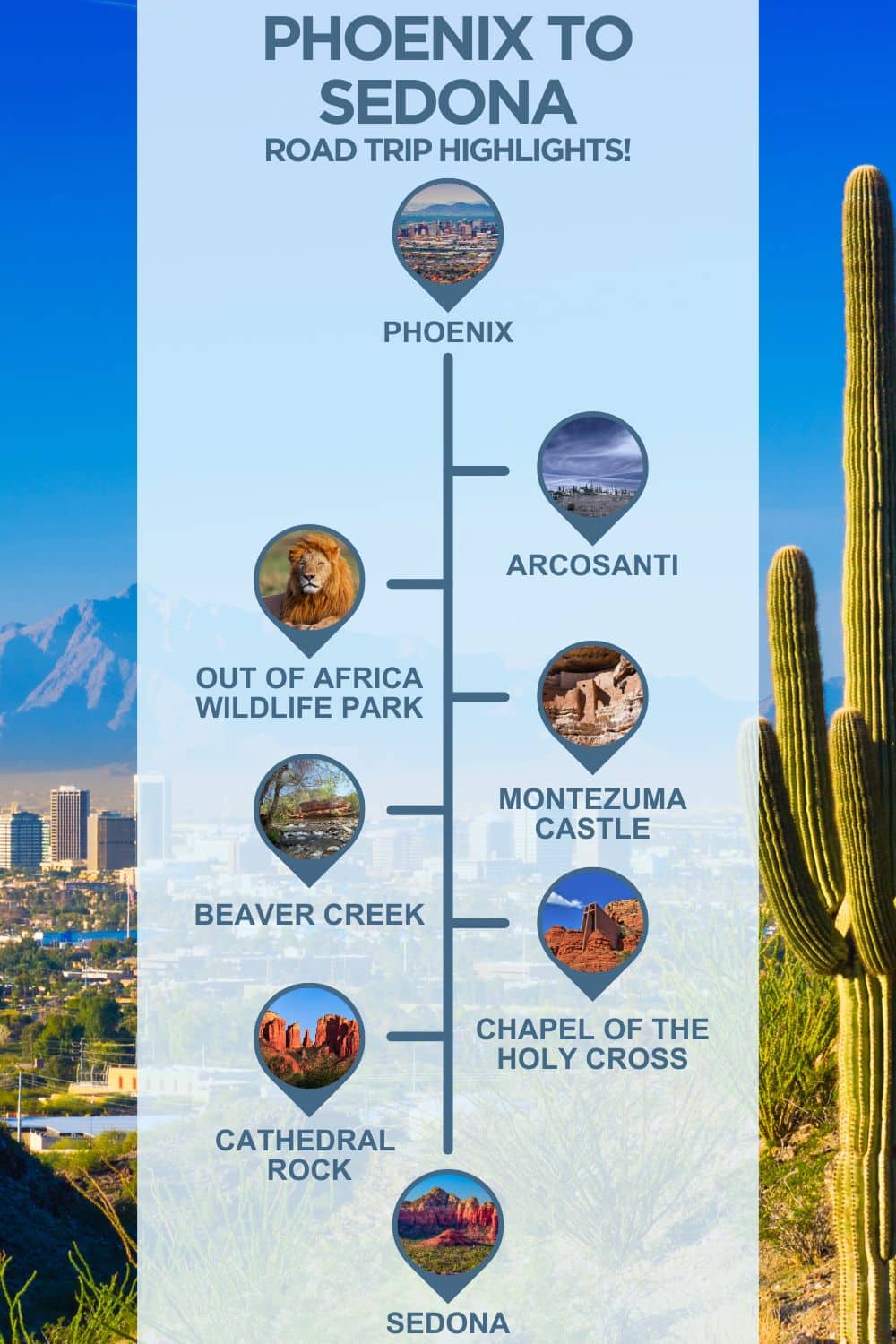 An infographic with images of phoenix, text reading "phoenix to sedona road trip highlights" and 6 stops with images between the two