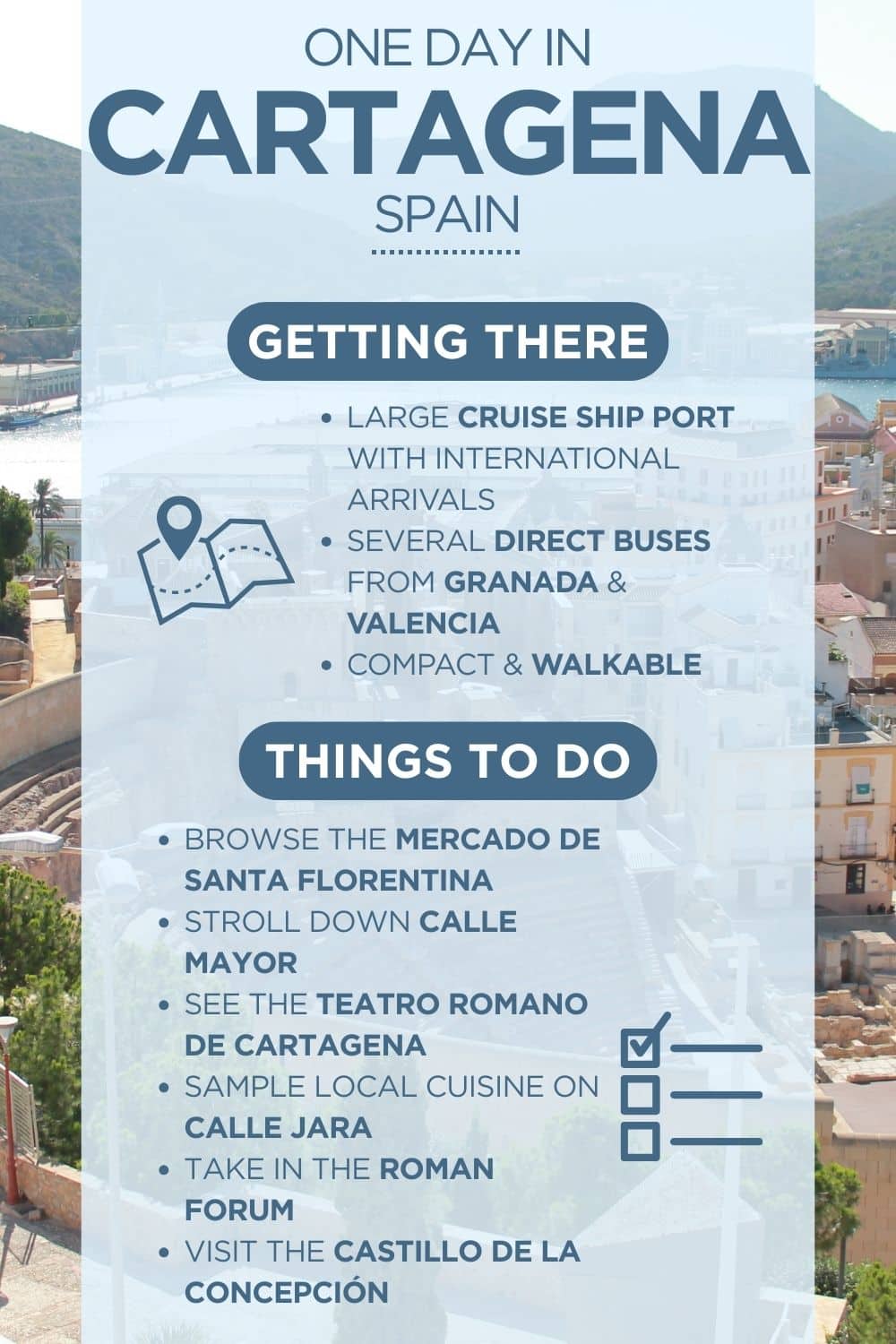 If you have the flexibility of renting a car while in Spain (we recommend using DiscoverCars.com to compare prices!), then a stop in Cartagena can be added onto a longer trip in the region of Murcia and along the Eastern Coast of Spain.